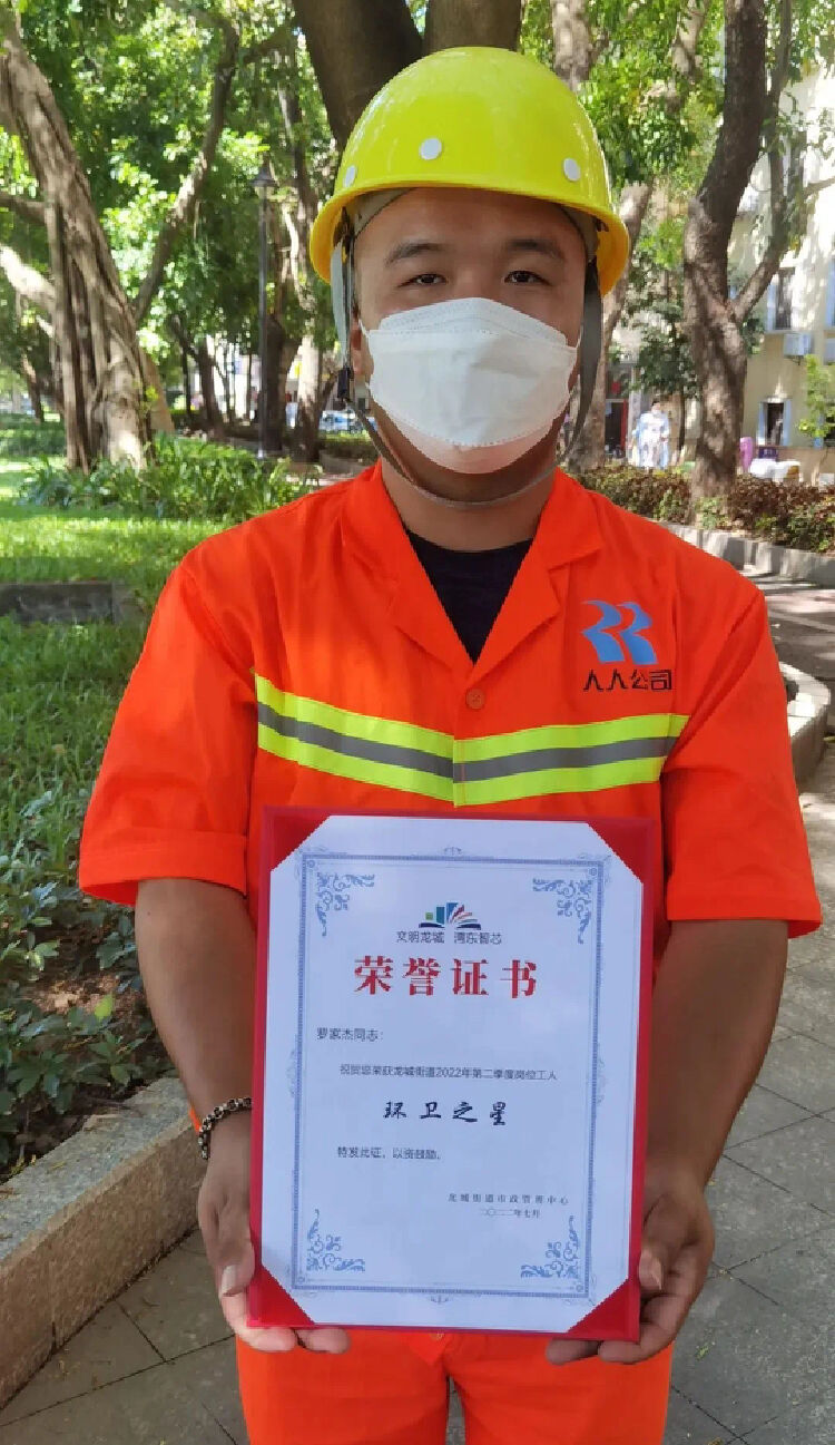 7月12日,龙岗区龙城街道举办2022年第二季度“环卫之星”表彰活动,罗家杰与另外11名环卫工人共同获得了荣誉。