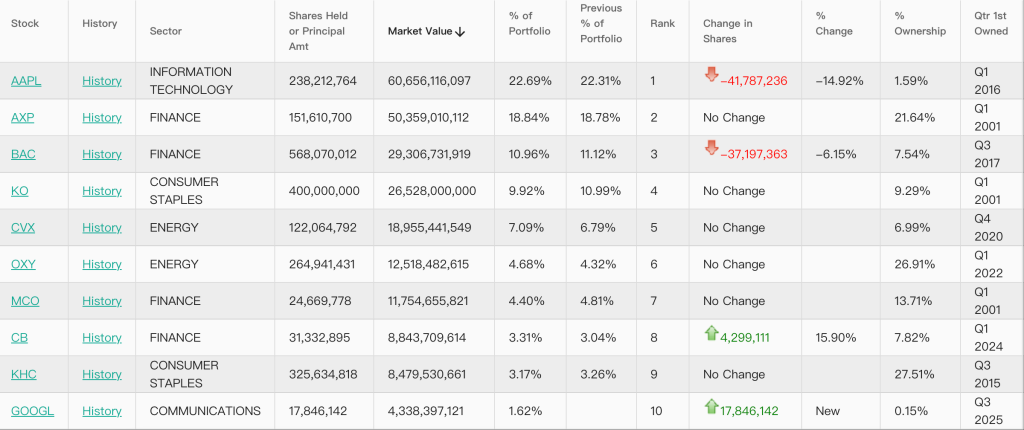 伯克希尔2025年三季度持仓