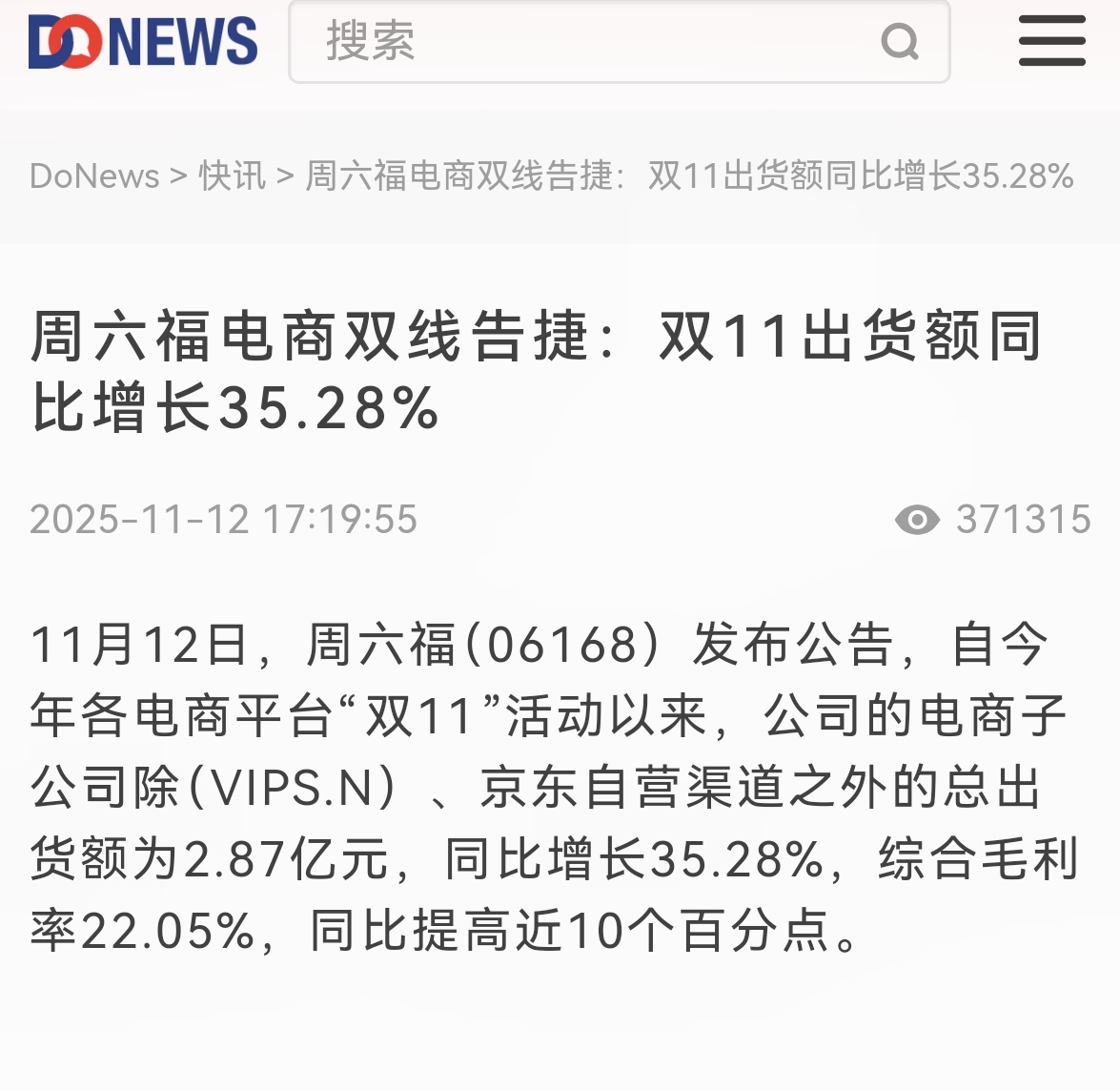 线上消费热情转化为企业销售业绩。以周六福为例,据其官方公告,周六福各电商平台“双十一”活动以来,除唯品会、京东自营渠道之外的总出货金额为2.87亿元,同比增长35.3%,综合毛利率,同比提升10个百分点。唯品会数据显示,“双十一”开幕1小时,周六福黄金品类销量同比增长68%。