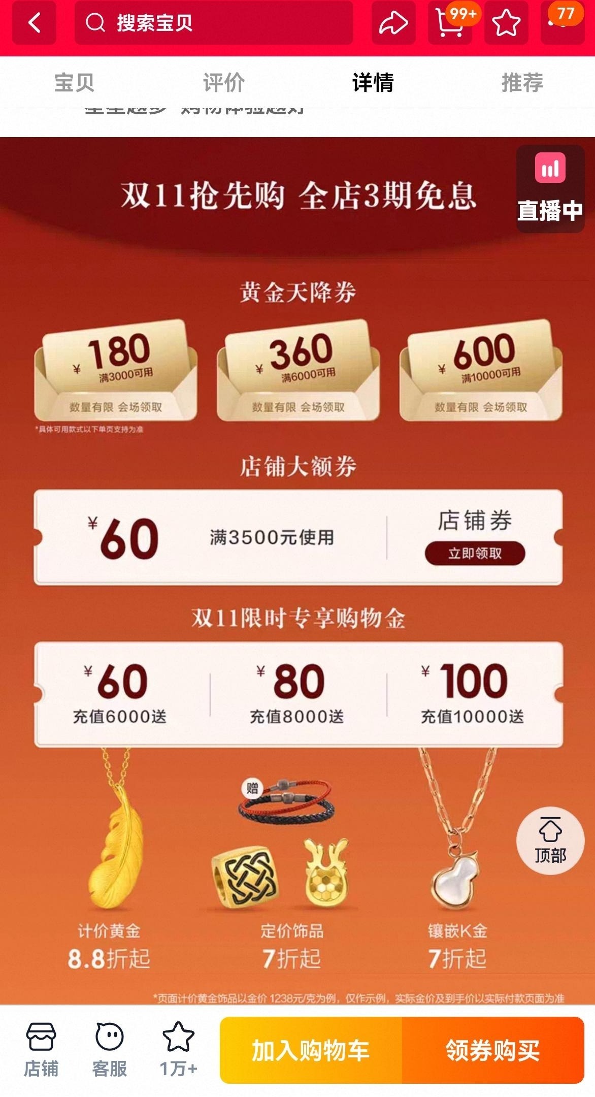 双11期间,品牌黄金市场呈现线上爆发与线下分化的鲜明特征。线上平台通过大额满减、直播间专属优惠和IP联名策略点燃消费热情。而线下门店因价格高企、消费需求不振。伴随金价上涨,行业正多元分化,加速打造差异化竞争壁垒。