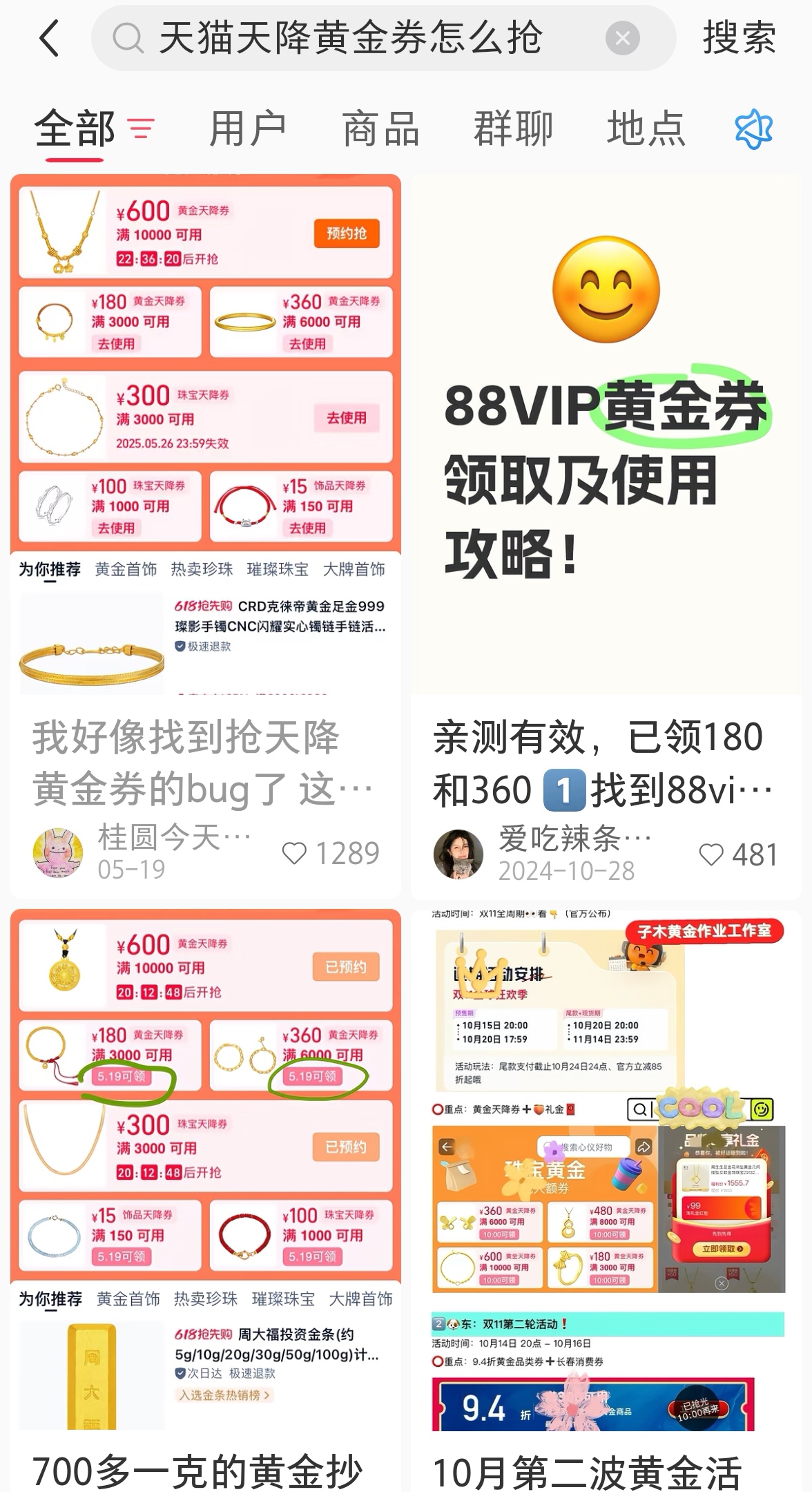 打开今年天猫双十一专场,发现10000-600元、6000-360元、3000-180元等不同档位的“黄金天降券”福利不间断发放中,消费者在线上能享受线下没有的显著价差,但上架即秒光,手慢即无。在网络上,网友们自发组织的“大牌黄金作业群”时常爆满再另开一群,切磋分享“抢券”攻略。