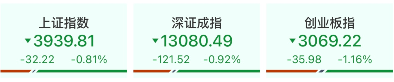 至收盘,上证综指跌0.81%,报3939.81点;科创50指数涨0.29%,报1357.93点;深证成指跌0.92%,报13080.49点;创业板指跌1.16%,报3069.22点。