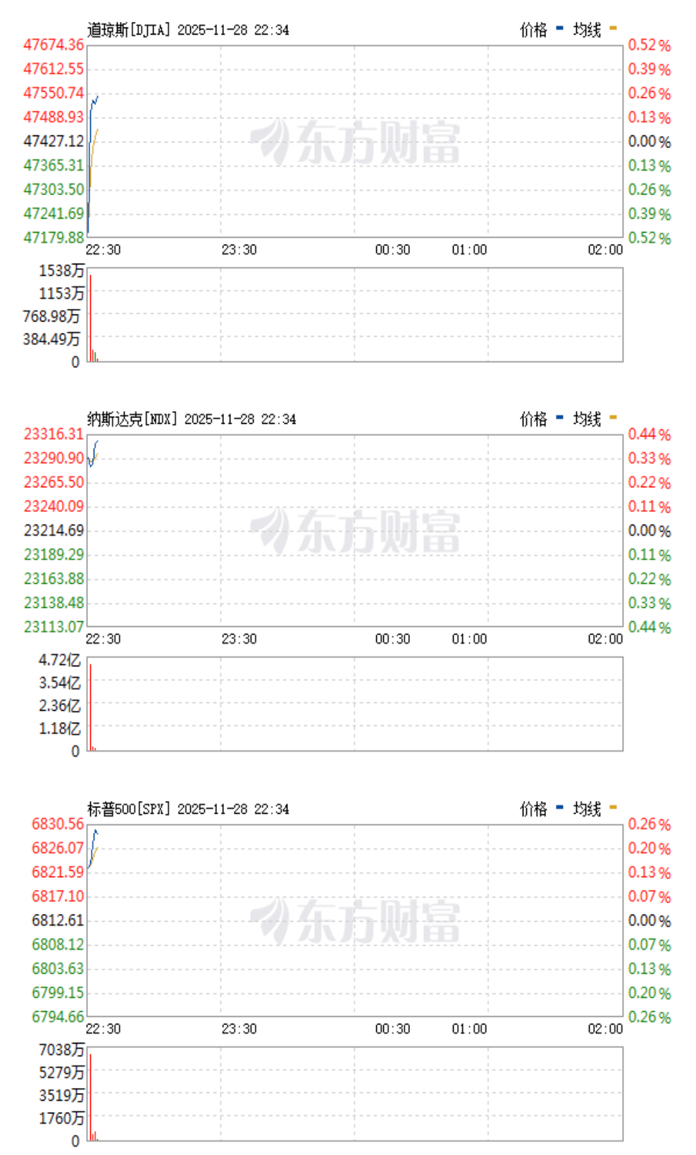 11月28日,美股三大指数上涨,截至发稿,道指涨0.16%,纳指涨0.33%,标普500指数涨0.17%。