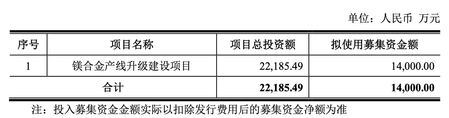 11月28日,鑫源智造(600615)公告,公司拟以简易程序向特定对象发行股票募集资金总额不超过1.4亿元,扣除发行费用后的募集资金净额将全部用于镁合金产线升级建设项目。