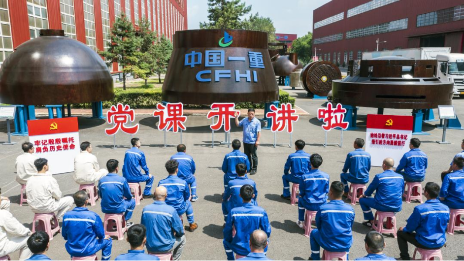 党的二十大代表、全国劳动模范、大国工匠、中国一重水压机锻造厂副厂长刘伯鸣在企业给一线产业工人讲党课