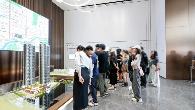 记者在现场看到,看房者中以年轻家庭和单身青年人才为主,展示中心的沙盘区、样板间均被“包围”:沙盘前,销售顾问用激光笔标注新皇岗口岸的位置,讲解“未来通勤动线”;样板间,多组家庭在畅想70㎡两房户型的生活场景;青年夫妇带着小孩在心怡的90㎡三房样板间内流连,满怀憧憬地讨论未来的家居布置。