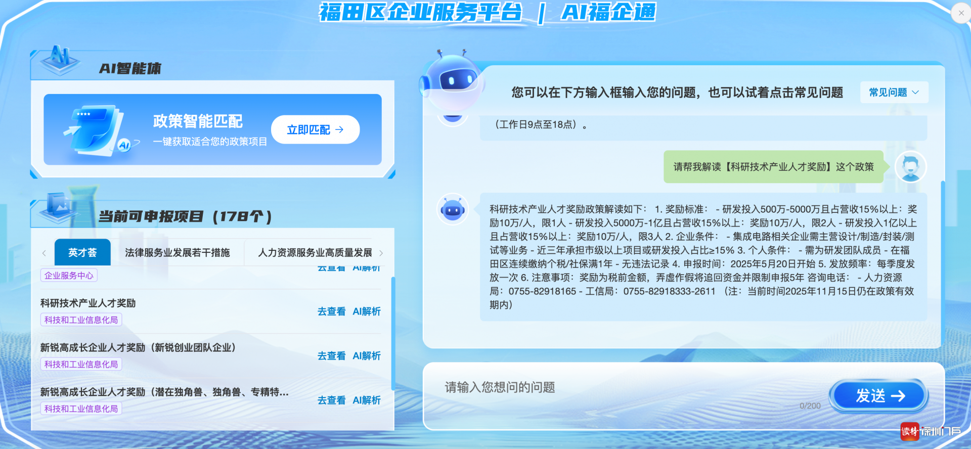 “以前企业找政策像大海捞针,现在政策主动找上门!”林秀莲现场演示着福田区企业服务平台,“AI福企通”的智能匹配功能引来围观者阵阵赞叹。屏幕上,系统只需几秒就能根据企业属性,精准推送适配的国家、省、市、区四级扶持政策,从政策查询、申报审核到资金拨付、信用监管,全流程线上闭环搞定。