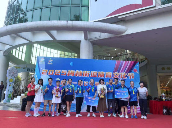 经过多轮白热化角逐,冠军归属尘埃落定:梅林一村一队凭借扎实功底与默契配合一路领跑,成功摘金;东鹏科技队在关键局中顶住压力、敢打敢拼,将银牌收入囊中;新阁乒乓队以顽强斗志稳扎稳打,斩获铜牌。颁奖环节,梅林一村社区党委书记敏娟为获奖队伍颁发奖杯与奖牌,选手们合影时,笑容格外灿烂。