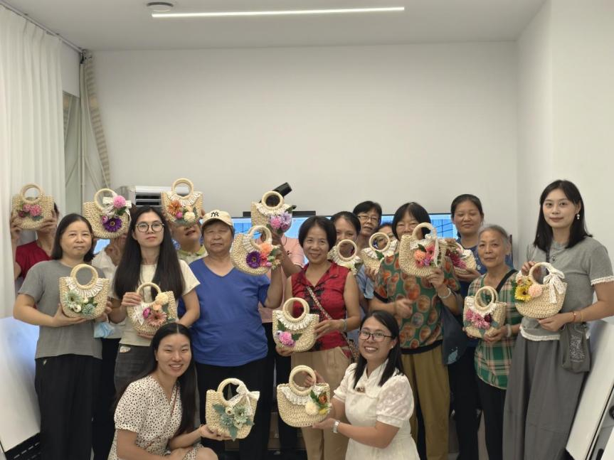 在社工的耐心指导下,居民们迫不及待地开始了自己的创作。大家先将分发到手中的各式干花花材细心分类、摆放,随后展开想象的翅膀,将象征高洁的梅花、清雅的雏菊等花材,精心设计、一一粘贴在朴素的草编包上。