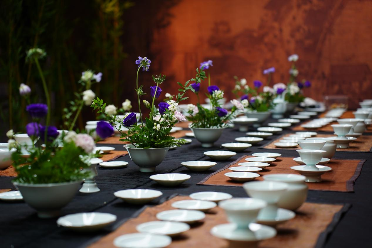 步入展厅,巨幅《清明上河图》的市井繁华与宋代书画的高雅韵致相映成趣。翠竹掩映间,一张长达六米的曲水流觞宴桌蜿蜒展开,近三百件青白瓷器具依古制陈列。这些由景德镇非遗传承人亲手复刻的器皿,在灯光下泛着“青如天,明如镜,润如玉”的莹莹光泽,令人恍见千年前宋真宗为之倾心的“景德”风华。