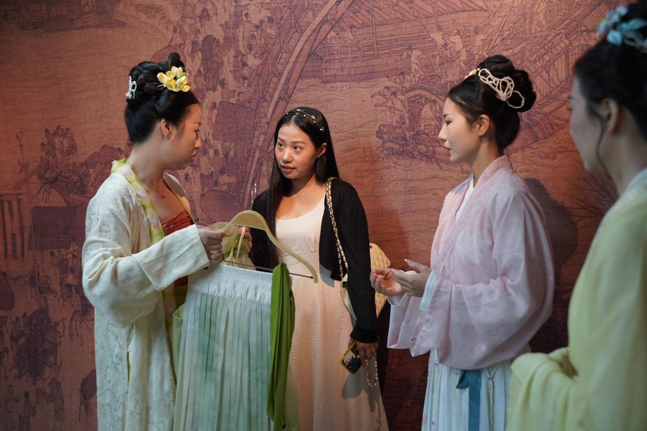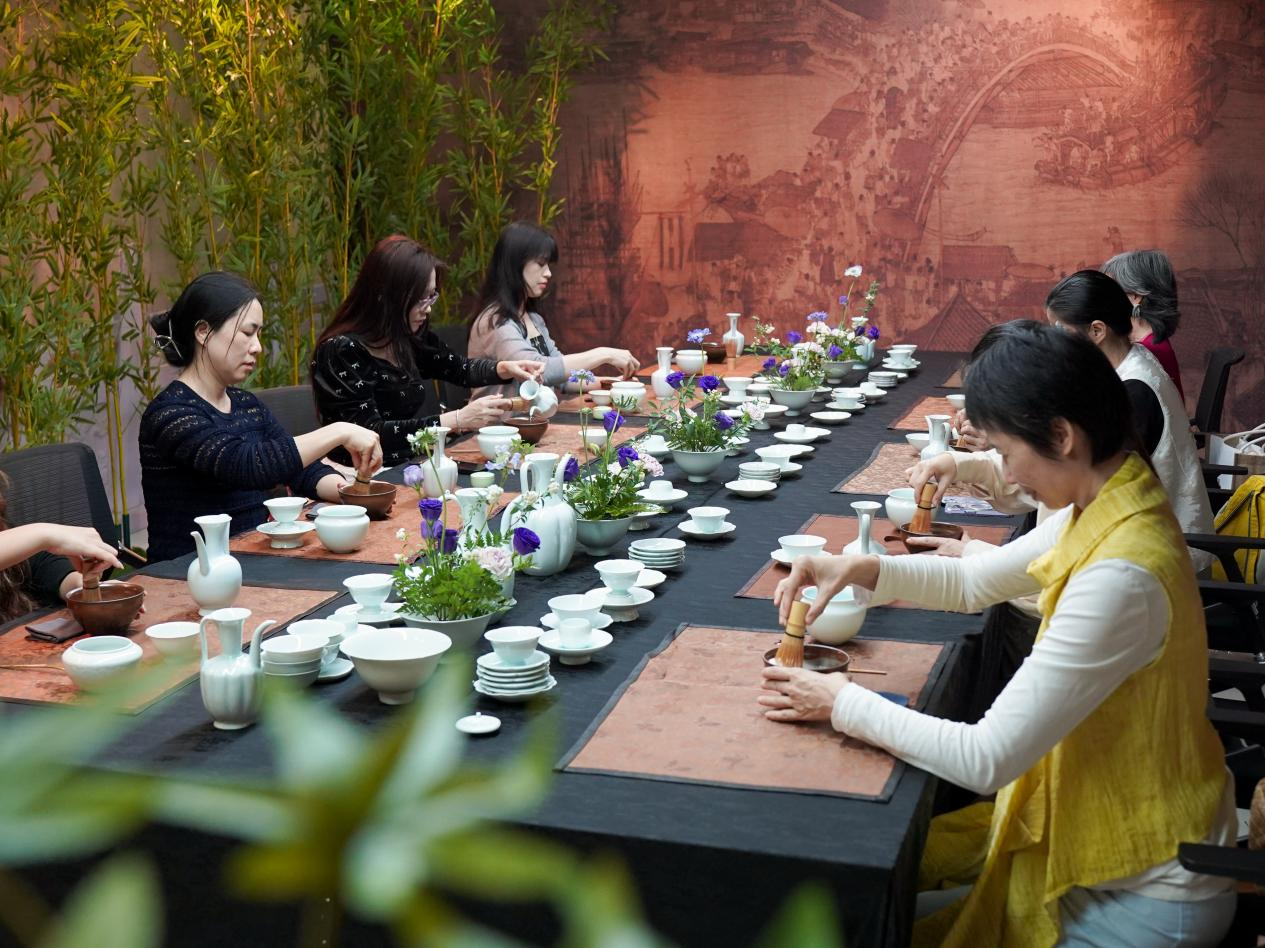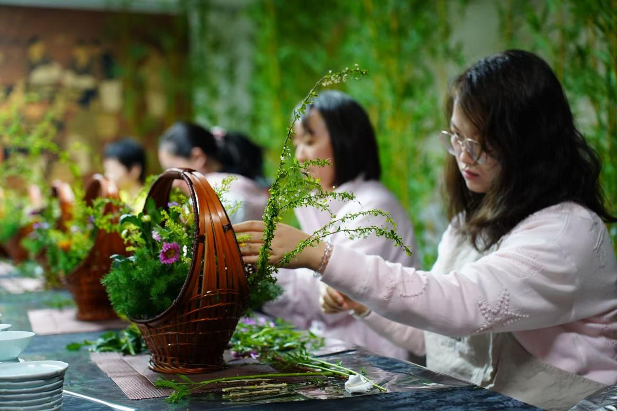 此次《雅韵宋宴》现场特设“宋人一日”体验区,一场穿越时空的雅集正在上演。居民可身着宋制服饰在点茶大师的指导下,学习“七汤点茶”与“分茶百戏”,执茶筅轻击慢拂,静下来品味茶与水的博弈。插花课堂上,学员们巧手修剪花枝,在传统花篮中构筑“疏影横斜”的留白美学。这一刻,千年时光在方寸之间悄然交融。