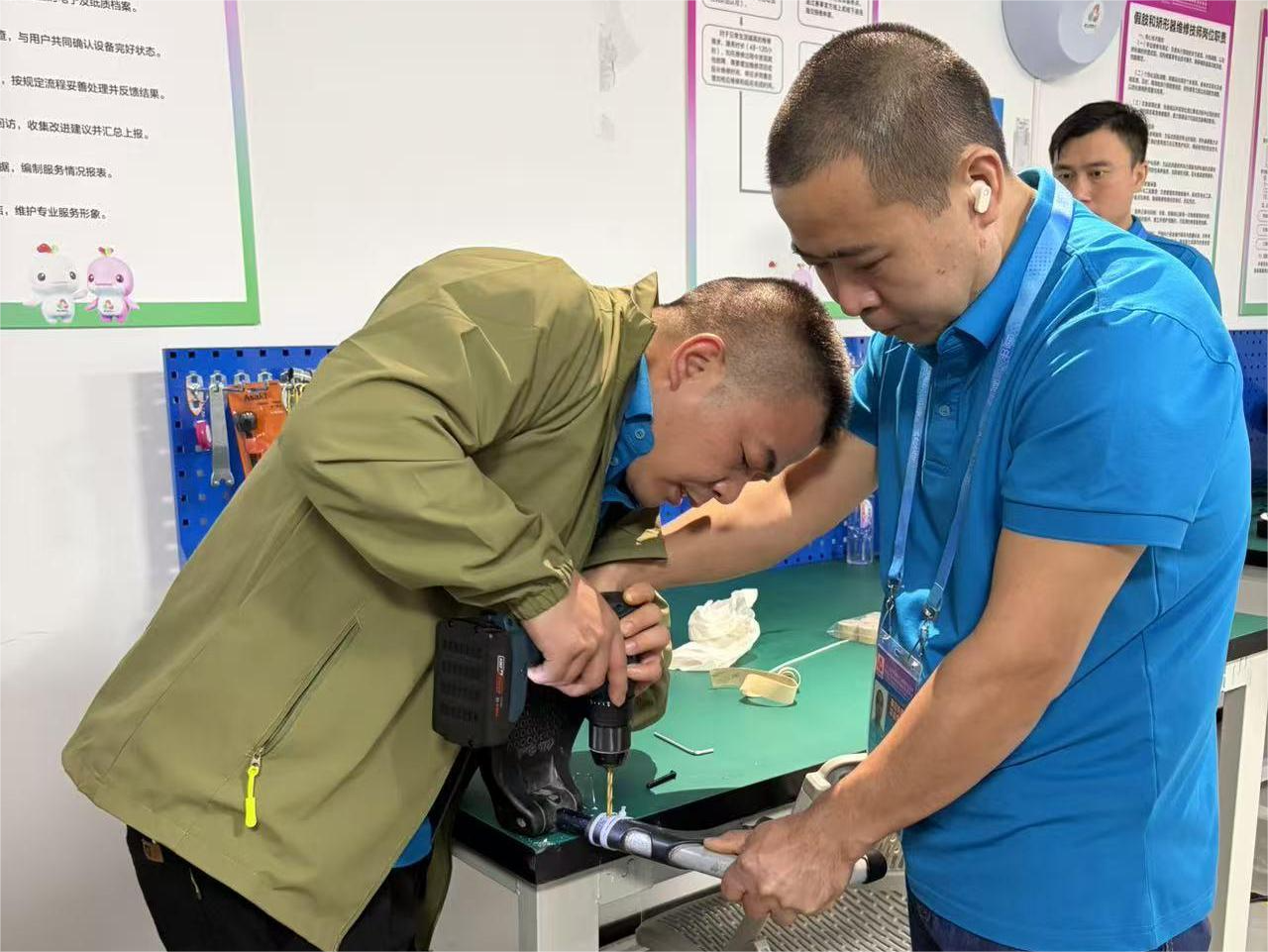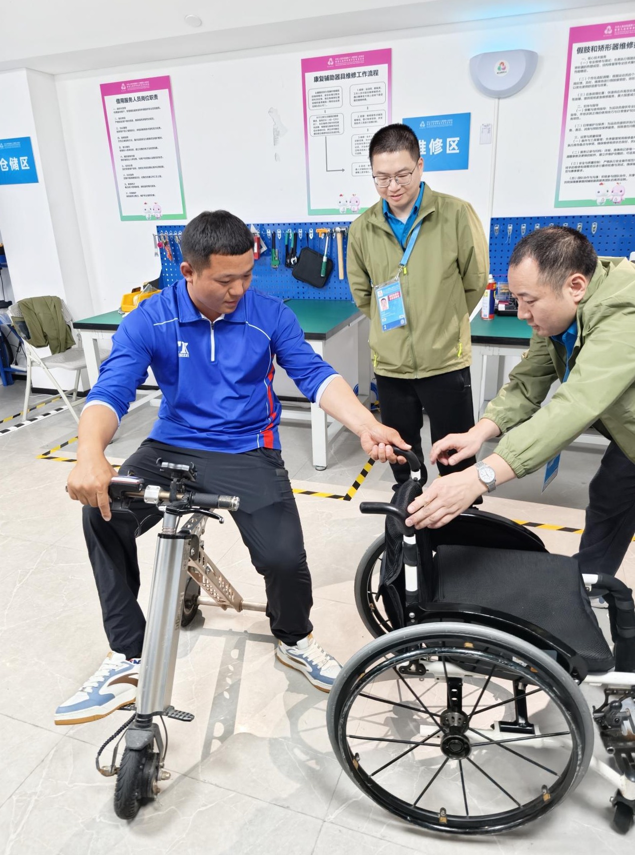 赛事期间,竞技类辅具的维修曾给团队带来不小挑战。“这类辅具日常接触少,配件需求特殊,第一天就遇到了运动轮椅辅助轮螺母滑丝的情况。”张涛回忆,团队迅速联动市级保障中心,在运动员要求的时限内完成维修,及时化解危机。针对羽毛球比赛中运动员频繁需要给轮椅轮胎打气的需求,团队果断优化流程,将打气筒直接配备在检录处和训练场,省去填表签字的繁琐环节,让服务更高效便捷。