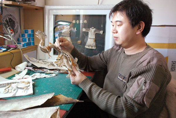 一次偶然的机会,宁雷看到亲戚制作的狗拉雪橇鱼皮画,粗糙的技法和单一的题材让他心生遗憾。“我有剪纸和雕刻基础,一定能把它做得更具艺术性。”带着这份信念,宁雷开始钻研鱼皮技艺。传统鱼皮画多为二维平贴,他便尝试创新,通过填充工艺实现三维立体效果。历时一年半、由2048片鱼皮羽毛镶嵌而成的《大鹏展翅》,不仅寓意鹏城“鹏程万里”,更成为其技艺创新的标志性作品;成名作《关公》突破传统平贴工艺,以半浮雕质感呈现出独特的艺术张力。