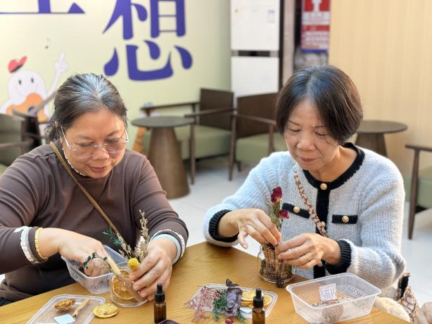 在老师的引导下,居民们兴致勃勃地开始创作。大家依据层次与色彩,将干花细心置入玻璃罐中。肉桂的温暖、松果的质朴、玫瑰的浪漫,再点缀上星星点点的满天星和清雅的尤加利叶,一个个层次分明、独具匠心的植物香薰逐渐成型。最后,滴入几滴植物精油,馥郁的香气缓缓散发,活动现场弥漫着自然清新的芬芳,令人心旷神怡。