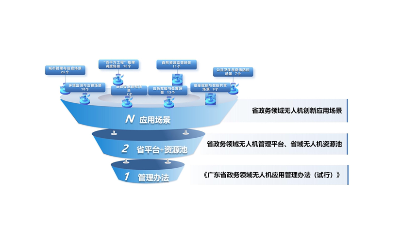 今年以来,广东创新构建全国首个省域政务无人机“1+2+N”工作体系,印发《广东省政务领域无人机应用管理办法(试行)》,构建省政务无人机管理平台和政务领域无人机资源池,首创“无人机即服务”共享用机模式,并在“百千万工程”调度、自然灾害应急、生态环保、城市管理等领域打造N个无人机创新应用场景,有力支撑政府治理效能持续提升。