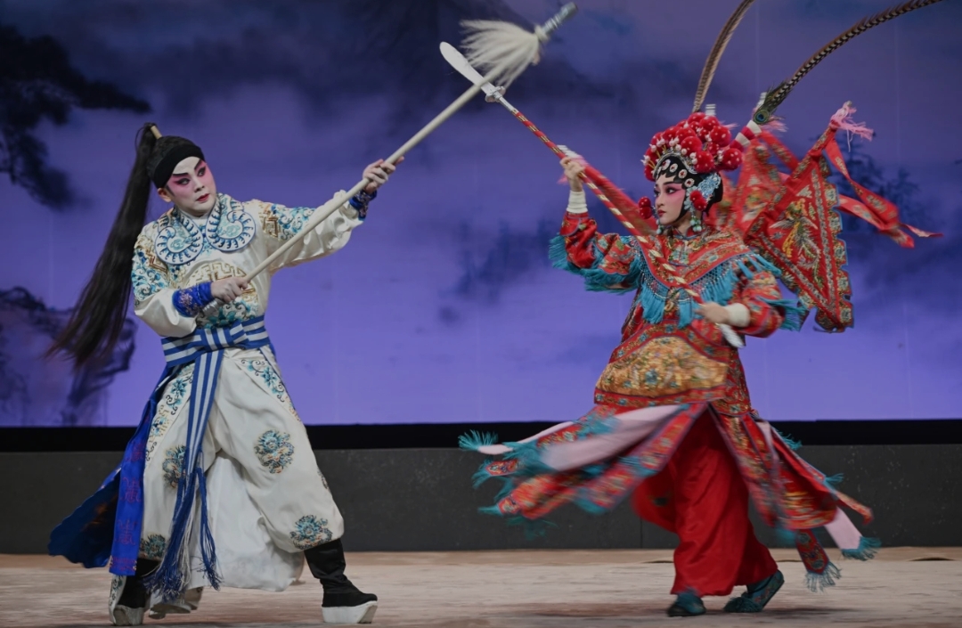 中国戏剧曲艺联谊会(澳门)总会带来两出粤剧折子戏:《白龙关》由阮德民、麦晓柔分别饰演白龙太子与呼延金定,他们在战火重逢中演绎爱恨交织的复杂情感,生旦对戏将粤剧行当的独特韵味展现得淋漓尽致。《汉宫惊魂》里,叶子铭与吴宇成分别饰演刘秀、马武,重现东汉权谋斗争的悲壮场面。叶子铭的“丝滑僵尸躺”惊艳四座,一招一式精准有力,引发全场喝彩!两出剧目既有战场柔情又有太庙惊梦,传统功架与戏剧张力完美融合,堪称视听盛宴!