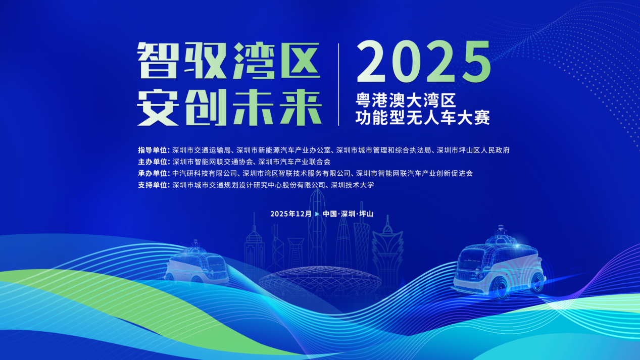 本届大赛在深圳市交通运输局、深圳市新能源汽车产业办公室、深圳市城市管理和综合执法局、深圳市坪山区人民政府指导下,由深圳市智能网联交通协会与深圳市汽车产业联合会主办,中汽研科技有限公司、深圳市湾区智联技术服务有限公司、深圳市智能网联汽车产业创新促进会承办,深圳市城市交通规划设计研究中心股份有限公司、深圳技术大学提供支持,以“智驭湾区·安创未来”为主题,旨在构建一个集技术验证、场景创新与产业协同于一体的高水平平台,推动功能型无人车在真实场景中的安全可靠运行与模式创新,进一步助力粤港澳大湾区智能网联交通生态体系的建设与完善。