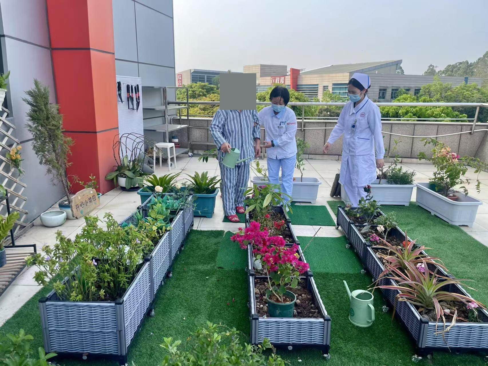 东莞市人民医院康复医学科天台花园,医疗护理员庞小素说浇花也是一种康复训练。