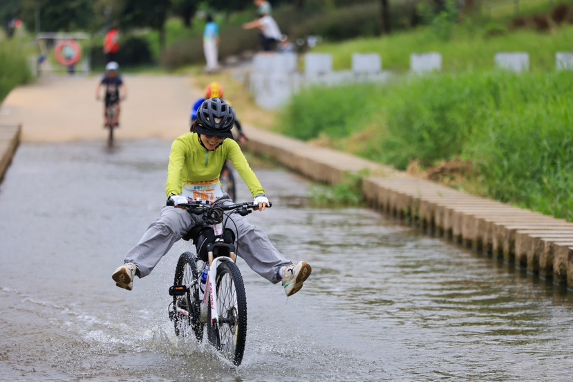 7时50分,五彩车流如丝带般蜿蜒出发。骑行者沿“明湖168”路线逆时针行进,环湖碧道旁卡通雕塑萌趣点缀,大凼水库边白鹭翩飞,与湖光天色相映成趣;转入茅洲河碧道后,水清岸绿的治理成果徐徐展现,V型桥跨越左岸科技园,以充满科技感的视觉语言,营造出穿梭未来之城的骑行意境。