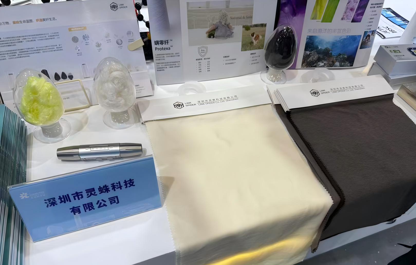 这样的创新成果在光明区展厅里随处可见:朴飞生物用咖啡渣、苹果皮等生物废弃物合成的“超级皮儿”生物基皮革,兼具科技感与时尚感;米倍生物利用微生物合成的PHA产品,成为替代传统石油基塑料的优质天然高分子材料;灵蛛科技研发的高性能蛛丝蛋白生物基纤维,驱螨率高达98.2%;宝舜泰生物、粒影生物等企业带来的焕龄喷雾等美妆产品,则让观众直观感受“生物美颜”的魅力。