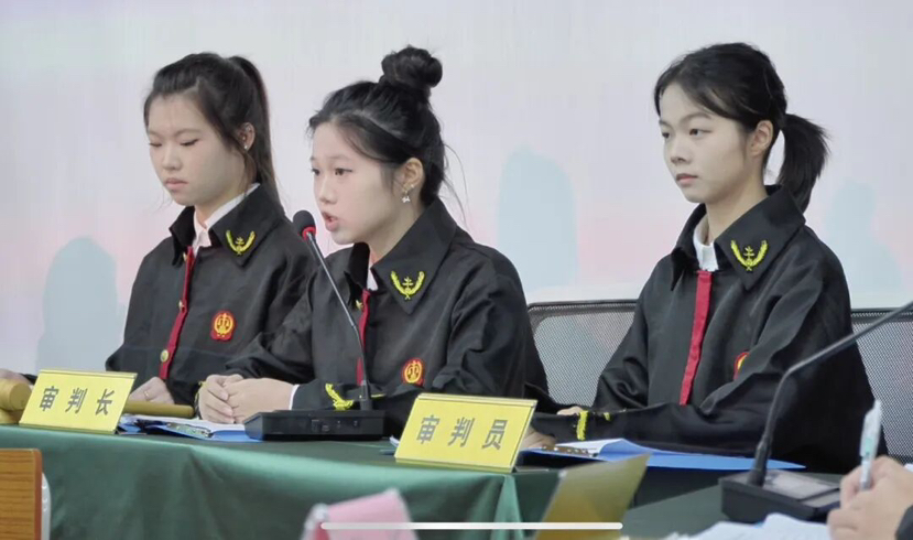 法槌敲响,正义“开庭”。13名学生分别化身为审判长、公诉人、辩护人、被告人等,演绎了一场由学生欺凌演变为故意伤害案件的庭审现场。