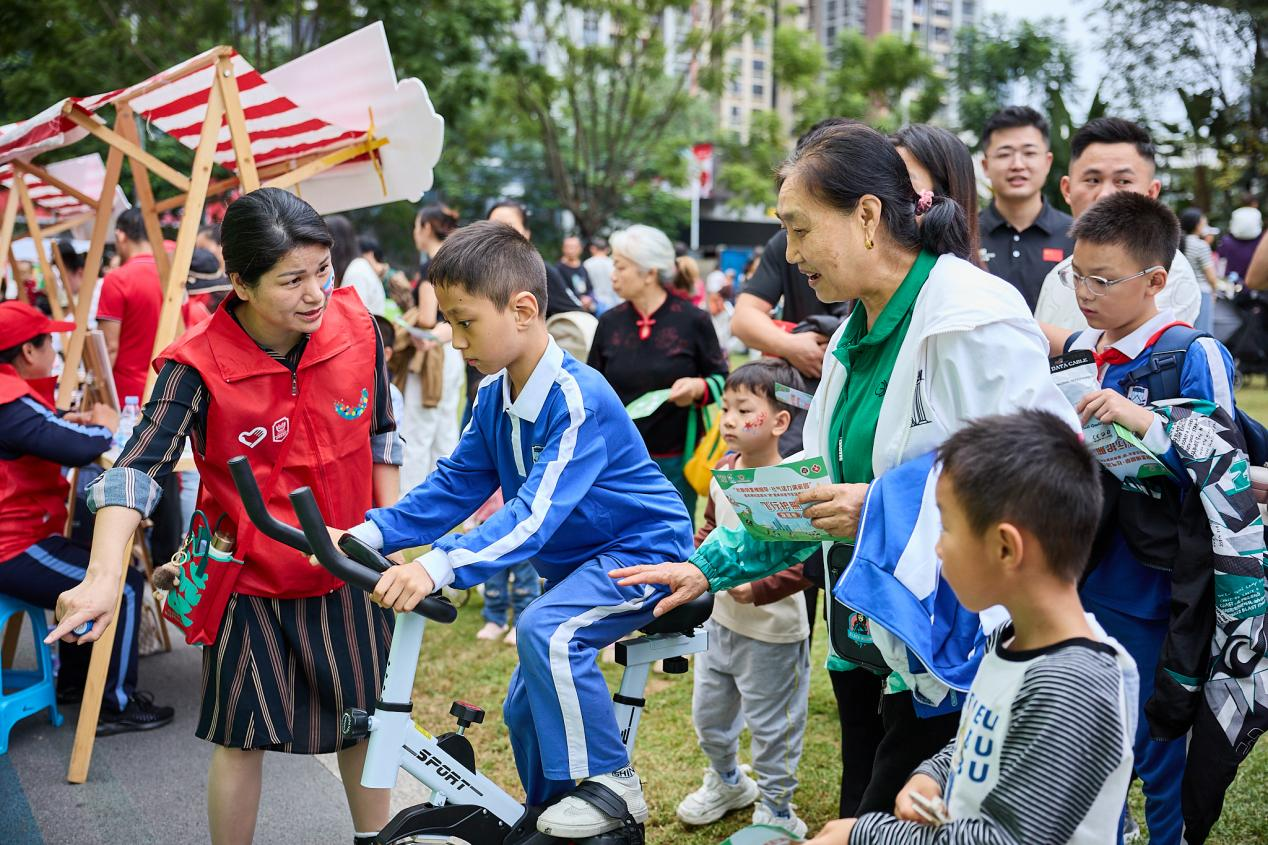 紧扣“十五运”主题,活动特设了“趣学十五运”知识问答与“全运总动员”发电单车体验两大特色环节。问答巧妙融入了马术、足球等赛事知识,居民在趣味互动中了解体育盛事;发电单车前,大人小孩轮番体验,通过骑行发电点亮赛事图标,现场欢呼声此起彼伏。活动不仅点燃了居民迎接全运会的热情,更将健康生活的理念传递到每个人心中。