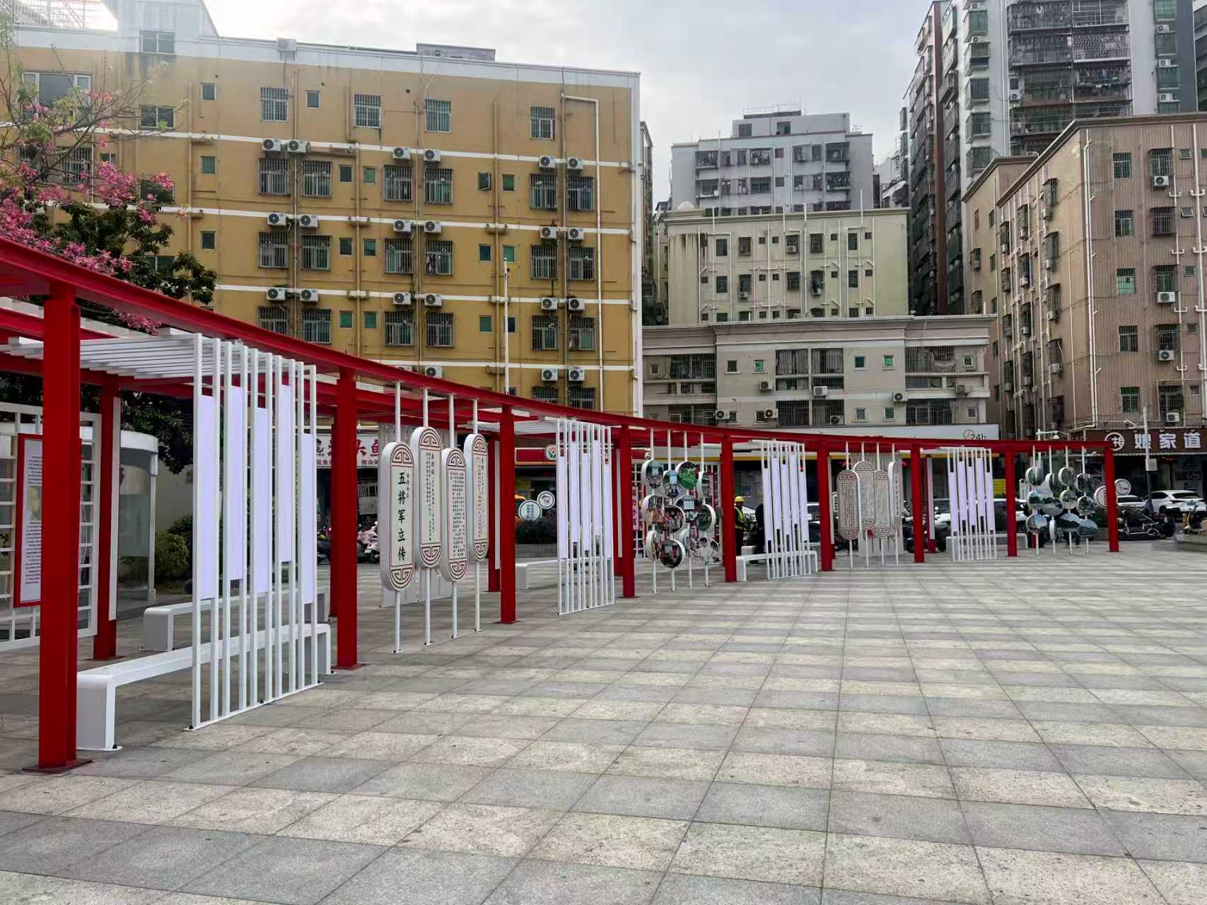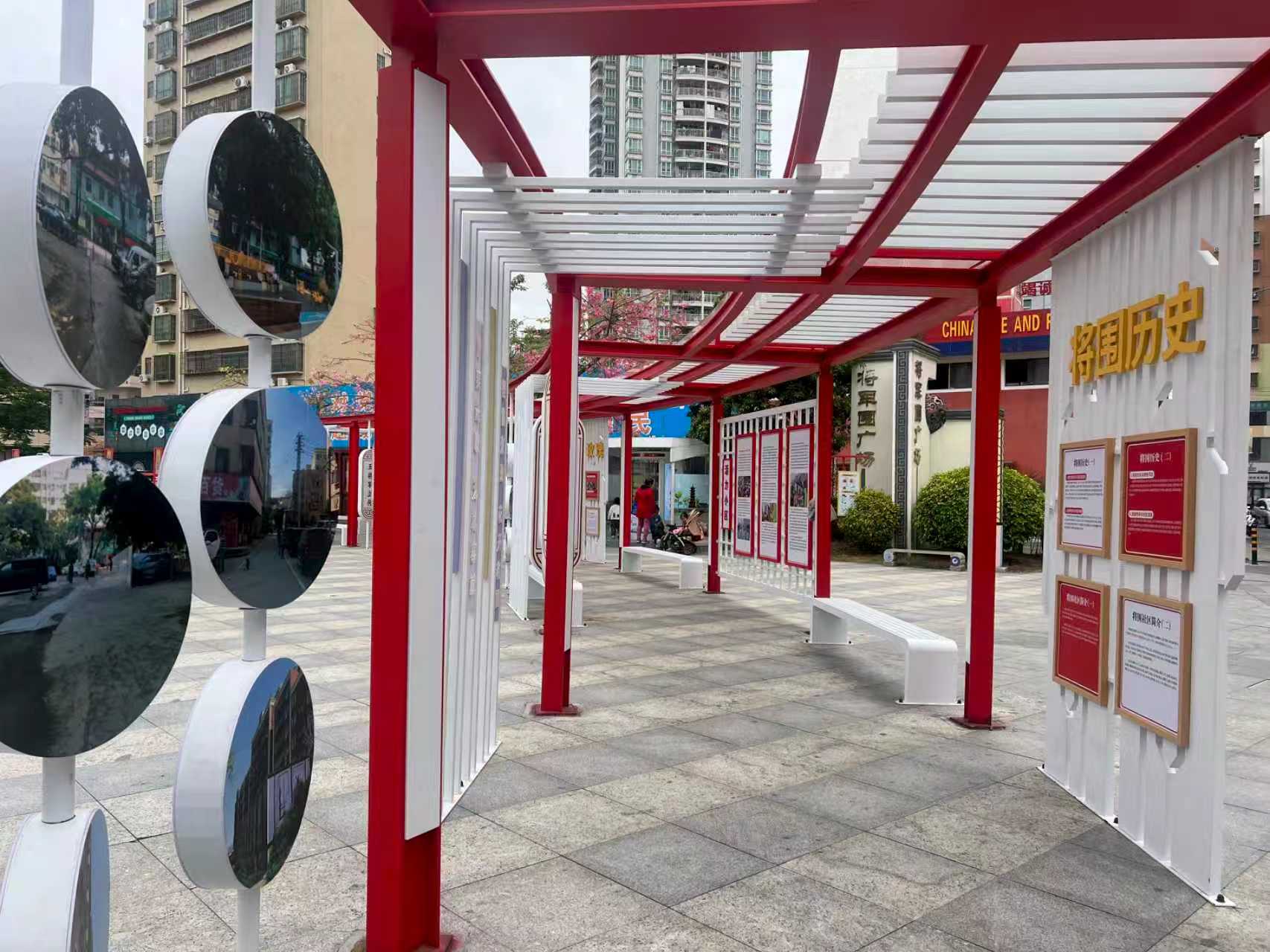 “将军精神・历史文化长廊园”惊艳亮相,以红白为主色调的现代棚架结构,既勾勒出城市更新的鲜明轮廓,更承载着城中村治理的文化根基。长廊深耕本土红色资源,通过图文并茂的展板系统呈现麦氏家族五位将军的英勇事迹,将散落的历史记忆凝练成可触可感的文化符号,让红色基因在漫步驻足间浸润人心。与此同时,长廊同步展示的“铿锵玫瑰”社区品牌成果与亲子活动剪影,以温馨瞬间串联家庭和谐与社区凝聚,实现了“文化传承+价值引领”的治理赋能,为城中村治理注入精神内核。