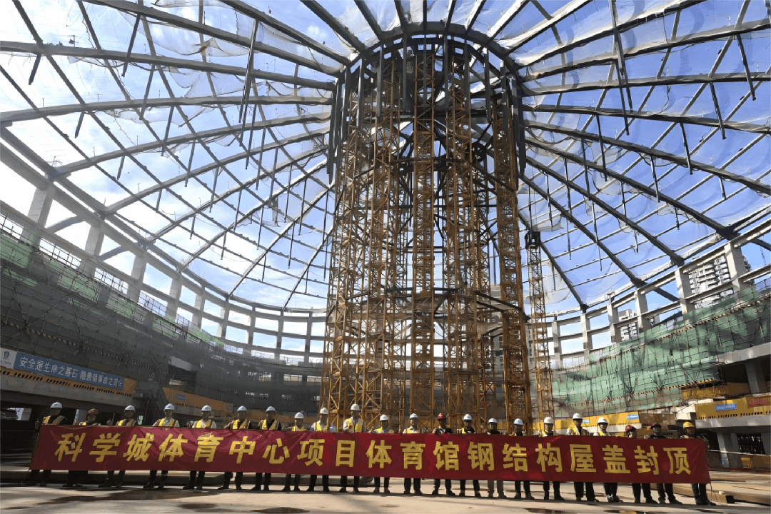 近日,光明科学城体育中心项目迎来体育馆主体钢结构封顶,标志着项目建设取得关键进展。