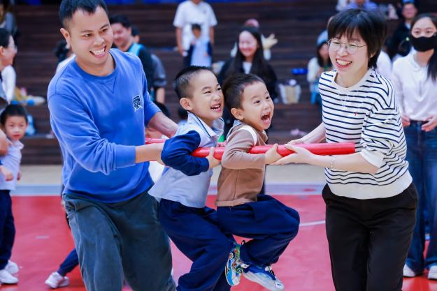 亲子运动环节将现场气氛推向高潮。小班、中班和大班运动项目同时进行,在老师的高效组织下,家长与孩子紧握双手、默契配合。呐喊声、欢笑声此起彼伏,运动场成为亲子情感交融的温暖空间。现场处处可见教师精心引导的身影、家园默契配合的场景,共同勾勒出科学城幼教发展的生动画面。