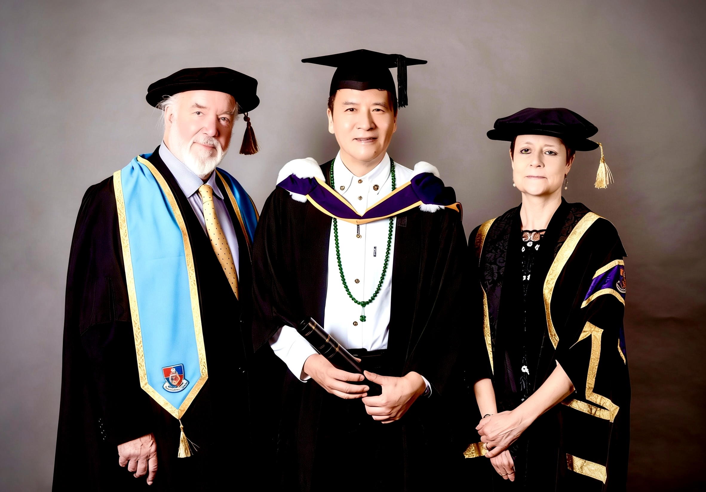 叶小钢(中)与Sir John Tomlinson CBE 世界著名男低音歌唱家,英国北方皇家音乐学院主席,Professor Linda Merrick CBE 英国北方皇家音乐学院校长,英国艺术院校联合委员会主席