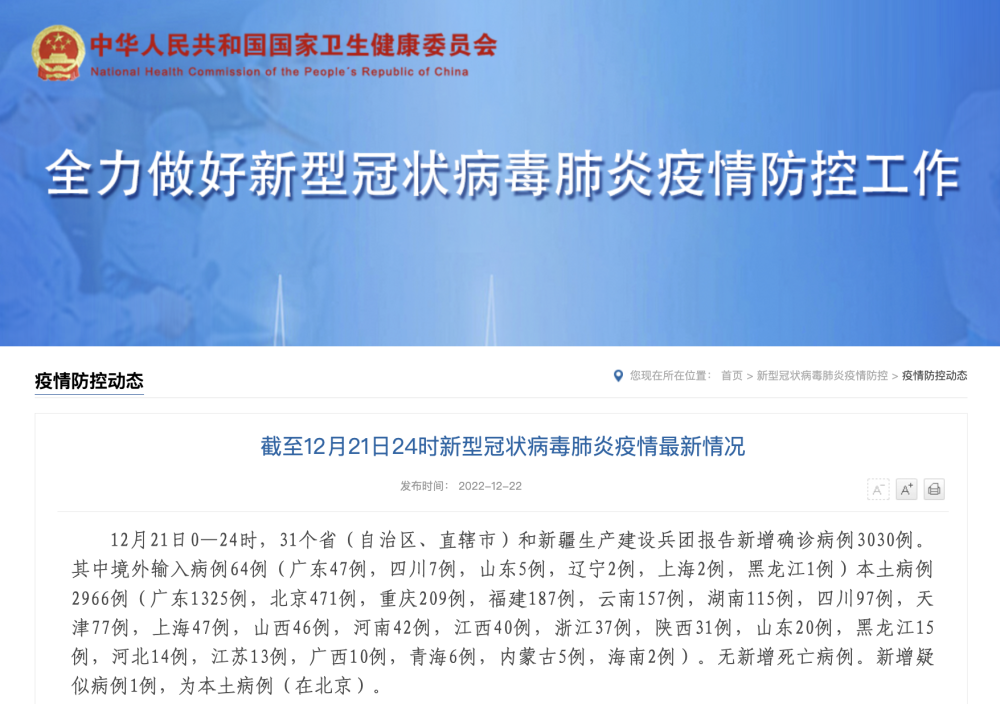 12月21日0—24时,31个省(自治区、直辖市)和新疆生产建设兵团报告新增确诊病例3030例。其中境外输入病例64例(广东47例,四川7例,山东5例,辽宁2例,上海2例,黑龙江1例)本土病例2966例(广东1325例,北京471例,重庆209例,福建187例,云南157例,湖南115例,四川97例,天津77例,上海47例,山西46例,河南42例,江西40例,浙江37例,陕西31例,山东20例,黑龙江15例,河北14例,江苏13例,广西10例,青海6例,内蒙古5例,海南2例)。无新增死亡病例。新增疑似病例1例,为本土病例(在北京)。