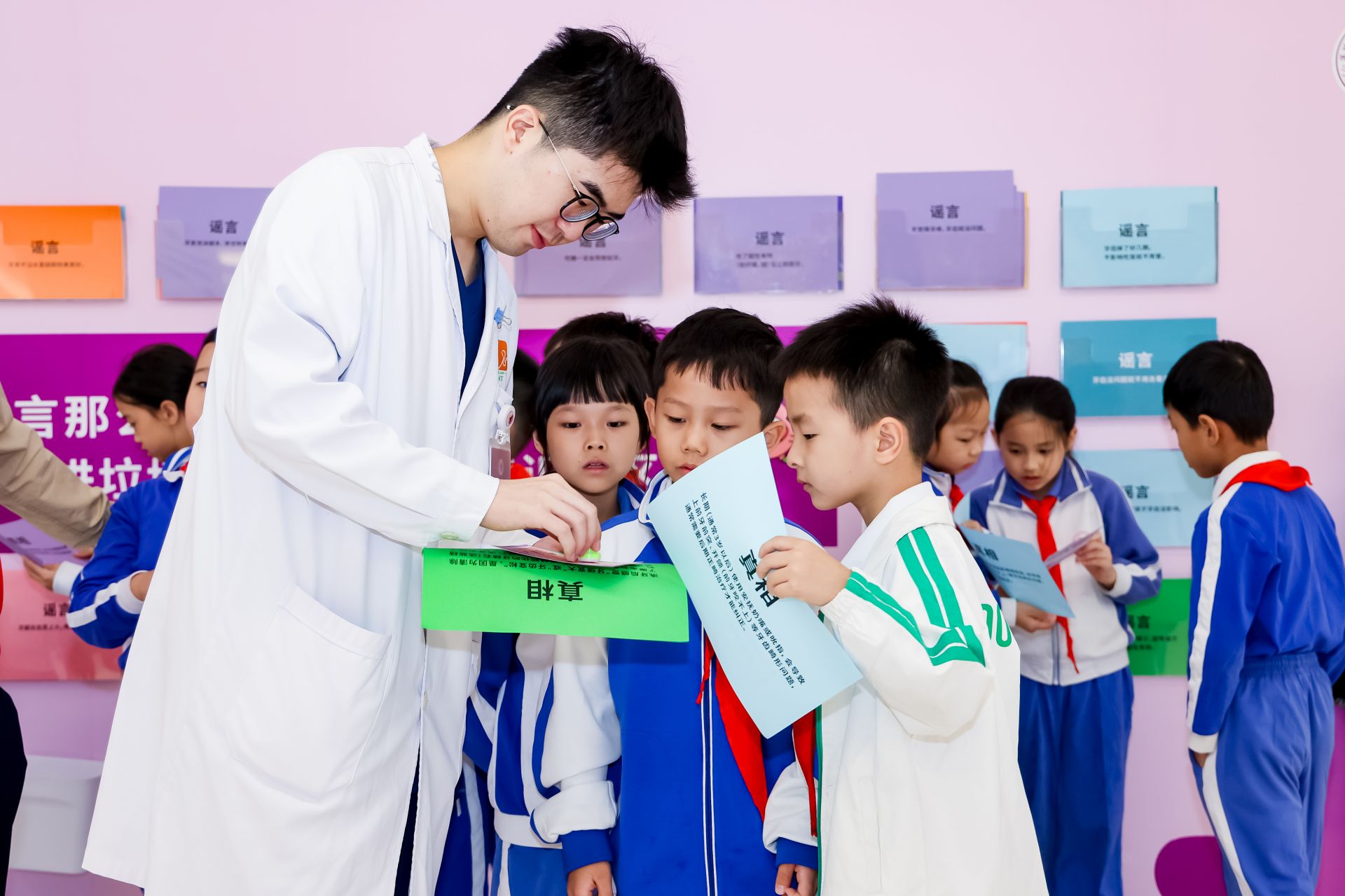一楼大厅的“牙卫士解谜行动”同样充满乐趣。在科普展区,“爱牙知识翻翻乐”通过可翻转立方体展示口腔健康知识;“看看你喝下多少糖”展区醒目呈现常见饮料的含糖量,直观警示糖分对牙齿的危害;“谣言粉碎机”则针对“孩子乳牙会换,蛀牙也不用治”等误区进行科普辟谣;孩子们手持问题卡片,穿梭在各展区中寻找答案,让书本上的“牙齿知识知多少”,在这里得到具象答案。活动尾声,孩子们都领取到了医院精心准备的爱牙护牙研学礼包,带着满满的护牙知识与快乐记忆返程,也让护牙意识深深扎根在每颗童心之中。