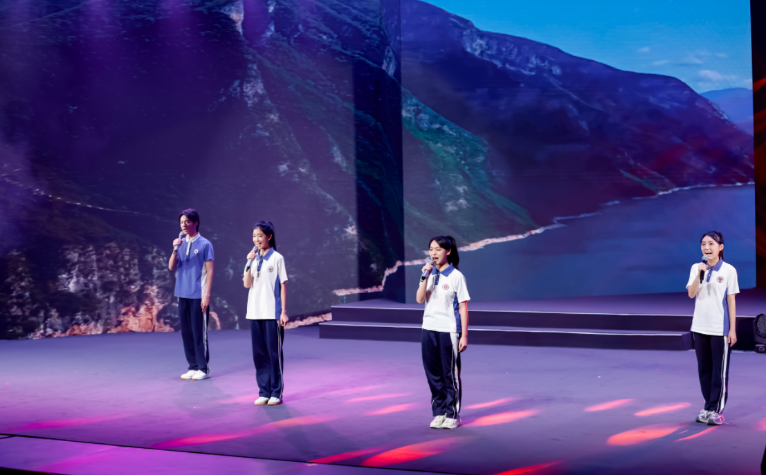 乐淮实验学校管乐团奏响《唱支山歌给党听》,悠扬的管弦乐旋律道出赤子对党的深情告白;姜贺、刘晶、李丹三位主持人朗诵的《采蒲台的苇》,通过芦苇的意象再现了革命岁月中的不屈精神;王英演绎的《不朽》,深情致敬为民族解放献身的先驱英烈;杨文带来的《我爱这土地》,用艾青的诗句传递对家国故土的刻骨依恋;深高园朗诵团的《何以华夏 何以中国》,以恢弘的追问探寻中华文明的精神密码,引发全场共鸣。