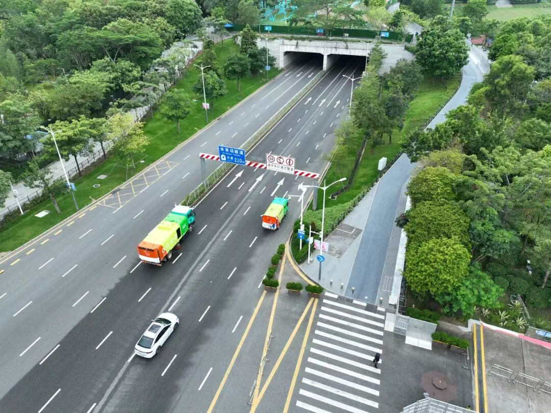 环卫作业中,龙城街道引入科技手段提升效率。每日清晨5时许,5台“小蜜蜂”无人环卫机器人在大运中心周边开展作业,配套“环卫机器人之家”智能终端实现全天候自动作业,环卫工人同步清理卫生死角。此外,6条重点道路安装湿度监测设备,洒水车每小时至少开展4次洒水作业;开展26次扬尘整治专项行动,推动90余个在建工地达到规范要求。