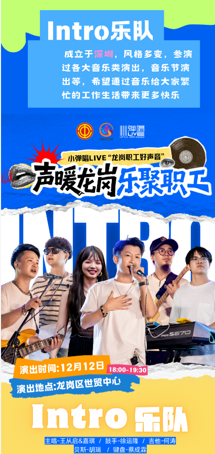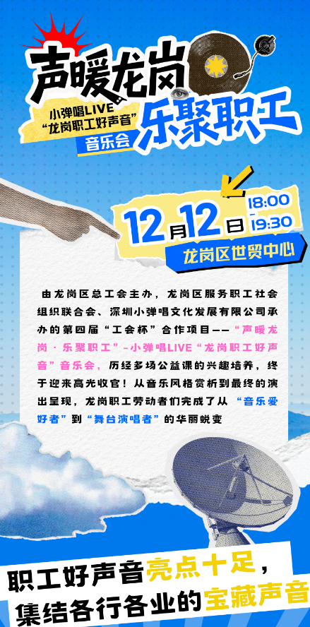 历经多场公益课的兴趣培养与打磨,第四届“工会杯”合作项目——“声暖龙岗・乐聚职工”小弹唱LIVE“龙岗职工好声音”音乐会将于12月12 日18:00-19:30在龙岗世贸中心迎来收官。这场由龙岗区总工会主办的音乐盛宴,将见证平凡岗位劳动者的华丽蜕变。