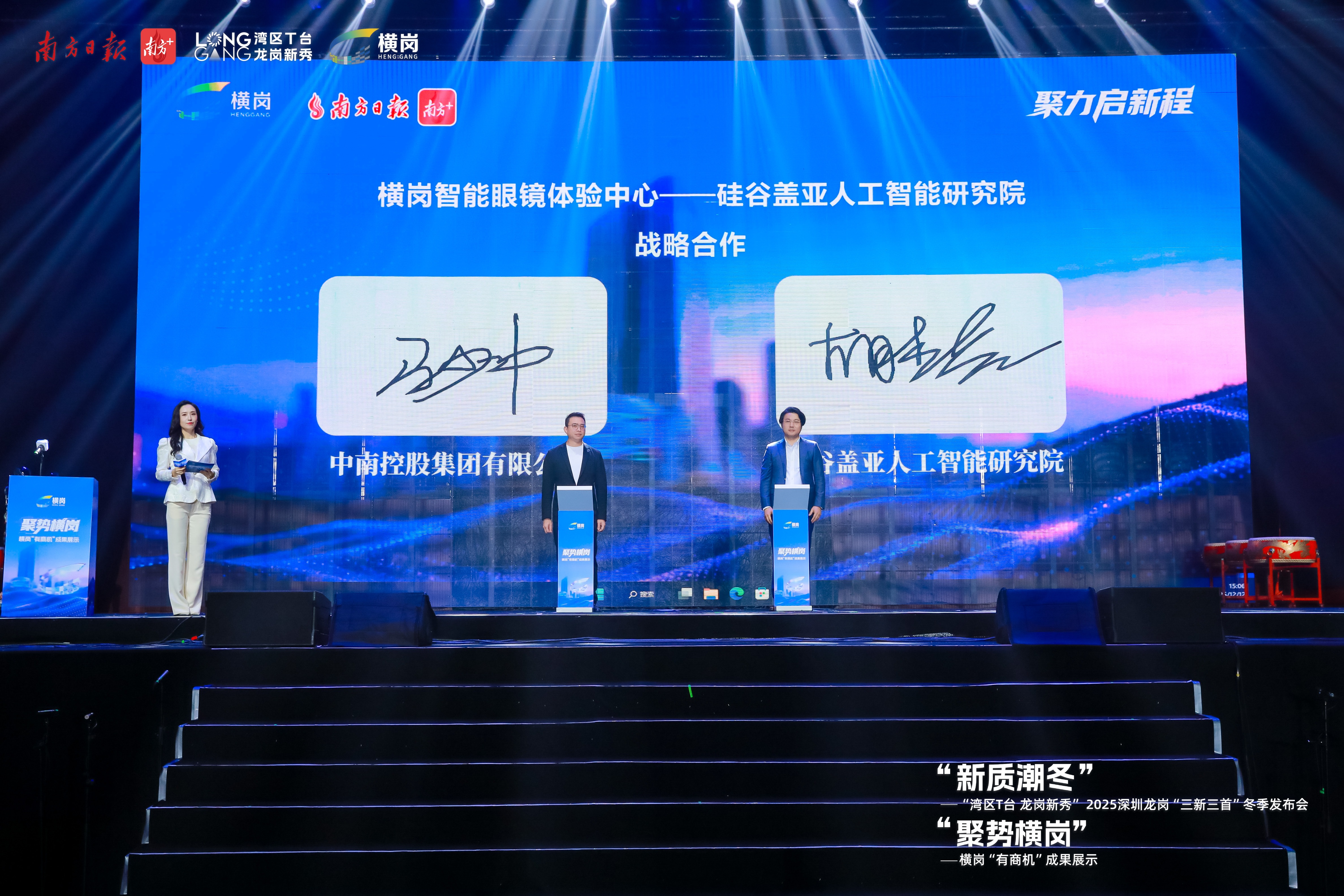 在“新质潮冬——2025‘湾区T台·龙岗新秀’冬季发布会”的新品发布和“一眼万年”T台秀环节,来自横岗街道的眼镜、黄金珠宝、服饰等时尚潮品和人工智能产品陆续亮相,也展示了横岗街道产业的多元化。同时,硅芯创新出品横岗卡通形象“AI宝”以情感陪伴的互动AI智能机器人身份出道。华清的眼镜、信德缘和金玉德尚的珠宝、奇策迭出的胖虎文创、品胜电子的氮化镓桌面磁吸桌面充电站和主动降噪耳机等在T台上纷纷亮相。系列潮品和电子产品吸粉不少。硅谷盖亚人工智能研究院更是在“三新三首”环节发布新品“盖亚人工智能”,提供为产业升级量身定制的AI赋能解决方案。