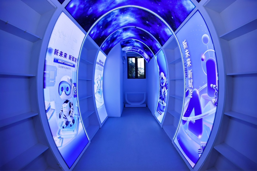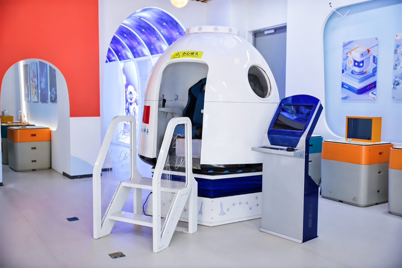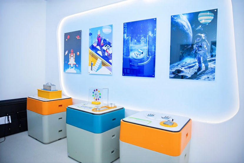 三联站位于三联社区招商臻城小区1栋1楼,面积逾200平方米。作为区、街重点打造的社区级科普枢纽,三联站以“科技赋能、互动体验”为核心,构建起兼具知识性与趣味性的科普空间。馆内配备了一系列先进的科普仪器与互动设备:VR太空体验舱让居民沉浸式“遨游”太空,感受宇宙的浩瀚神奇;力学传动实验装置、电磁感应演示仪等多种互动科技仪器,可通过亲手操作直观理解基础科学原理;科普图书室藏书涵盖少儿科学启蒙、人工智能等多个类别,满足不同年龄段居民的阅读需求;活动联动区可容纳30—40人开展科普讲座、趣味实验、手工制作等集体活动。