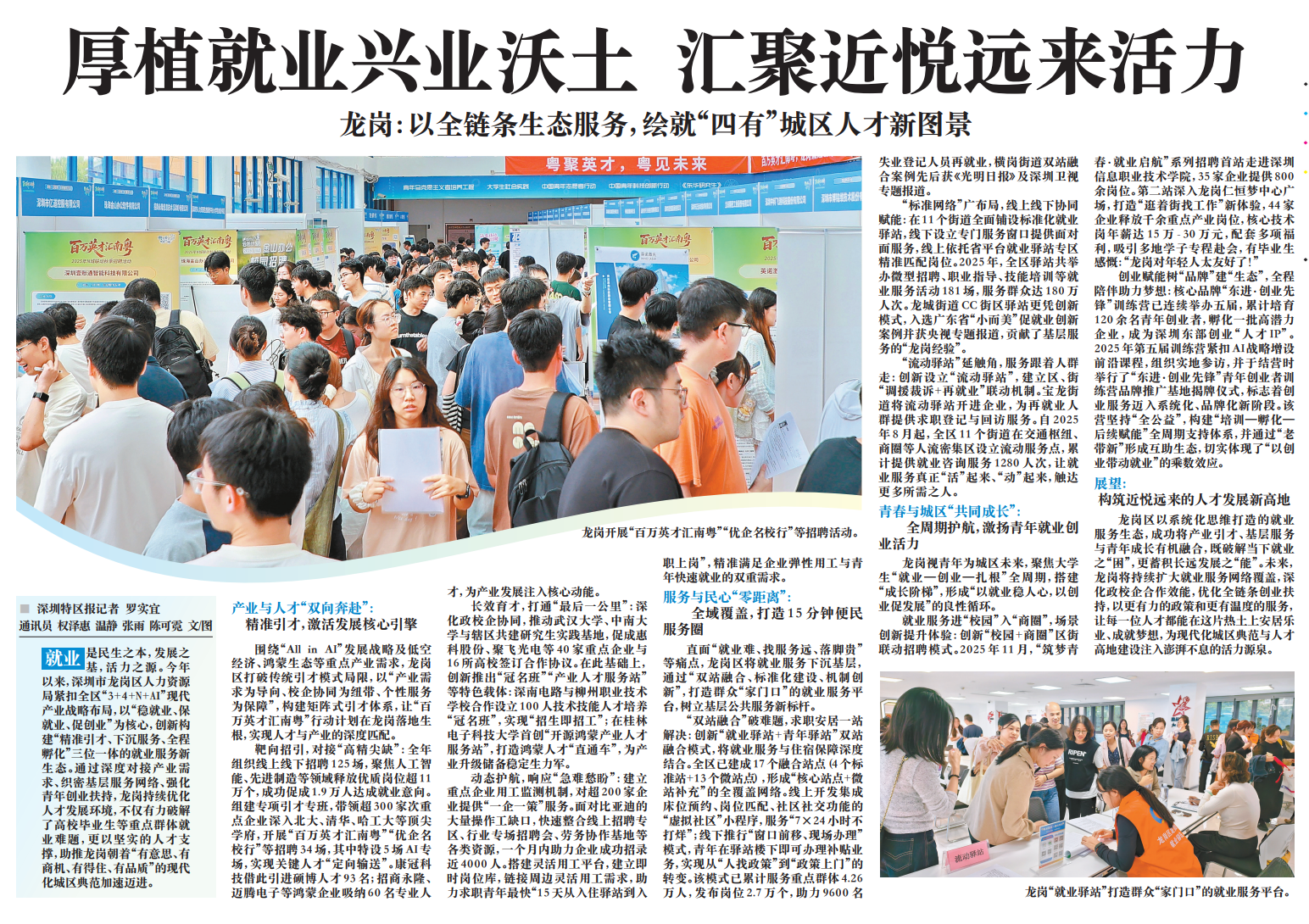 就业服务进“校园”入“商圈”,场景创新提升体验:创新“校园+商圈”区街联动招聘模式。2025年11月,“筑梦青春·就业启航”系列招聘首站走进深圳信息职业技术学院,35家企业提供800余岗位。第二站深入龙岗仁恒梦中心广场,打造“逛着街找工作”新体验,44家企业释放千余重点产业岗位,核心技术岗年薪达15万-30万元,配套多项福利,吸引多地学子专程赴会,有毕业生感慨:“龙岗对年轻人太友好了!”