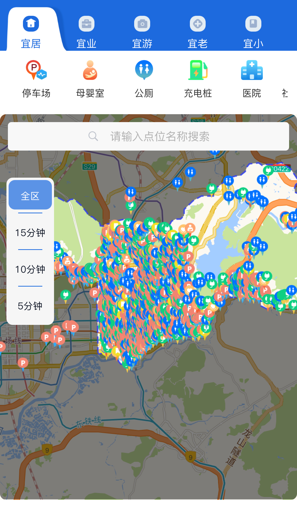 打开“15分钟便民生活圈”,使用者能直观看到身边5分钟、10分钟、15分钟步行可达的公共服务资源,并通过数字地图的形式,按照“宜居、宜业、宜游、宜老、宜小”等不同场景分类,清晰标注了各类公共服务设施所在位置。从街道办事处、社区工作站、党群服务中心、社康中心,到医院、学校、图书馆,乃至就业促进中心、热门旅游景点、充电桩、母婴室、AED等,居民只需轻松点击,即可获取导航和相关服务信息。