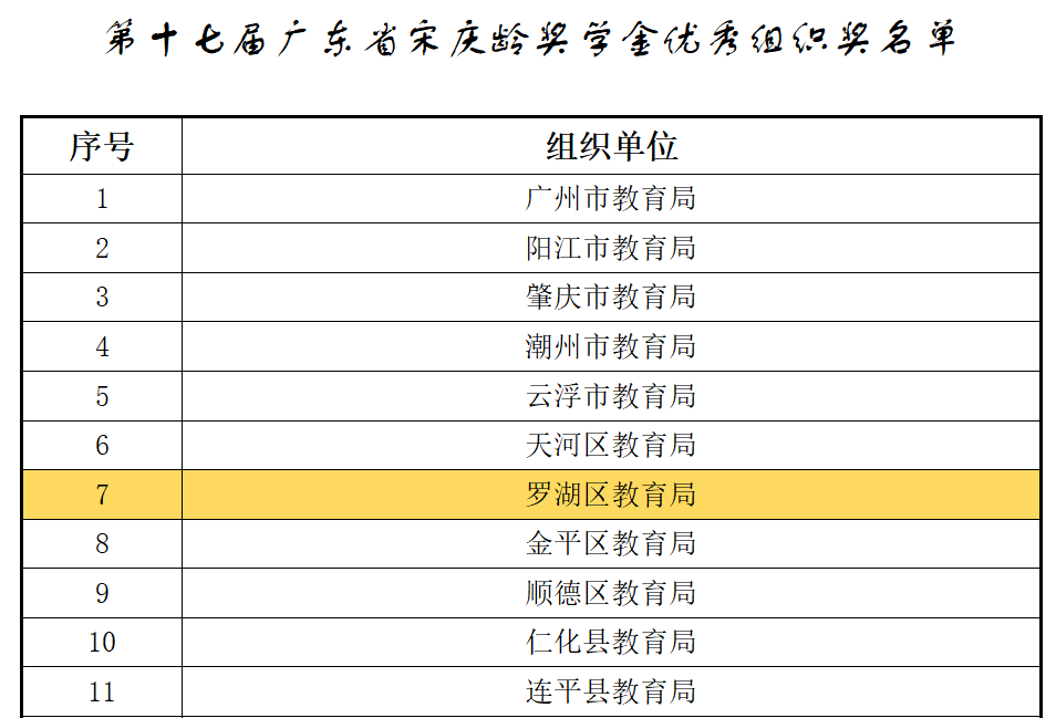 近日,广东省宋庆龄基金会公布了第十七届广东省宋庆龄奖学金获奖名单。经广东省宋庆龄奖学金评审委员会及广东省宋庆龄基金会主席会议审议确认通过,并经网上公示,罗湖区共有4名学子获奖,分别来自翠园中学、罗湖高级中学、罗湖外语学校、深圳市行知职业技术学校。罗湖区教育局荣获深圳市唯一组织奖。