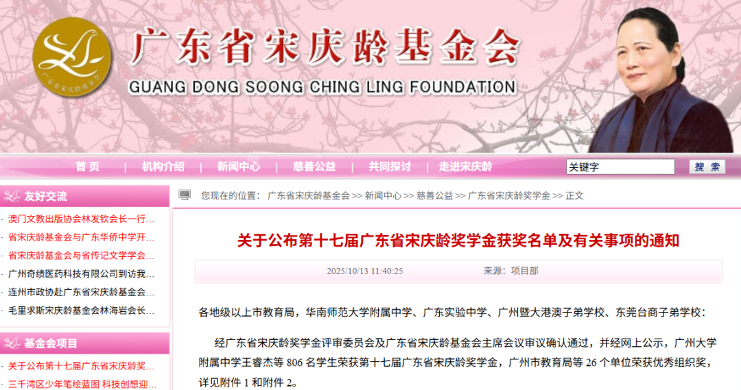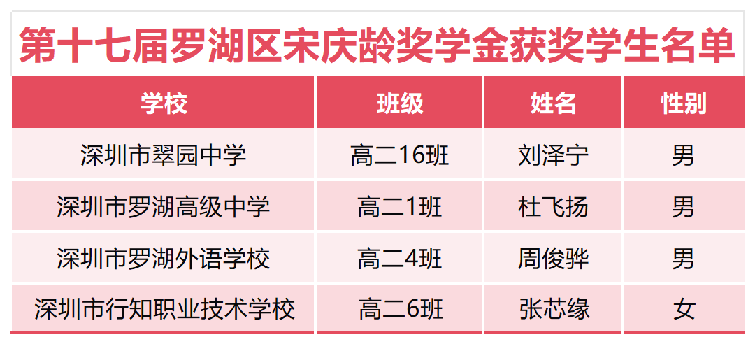 据悉,广东省宋庆龄奖学金由广东省宋庆龄基金会与省教育厅于2009年共同设立,每年评选一次,按全省在校高二级学生人数的千分之一确定名额,经过省内审核筛选,罗湖区四位学子获第十七届广东省宋庆龄奖学金。全省共有806名学生荣获第十七届广东省宋庆龄奖学金,深圳市87名学子获得该奖学金。