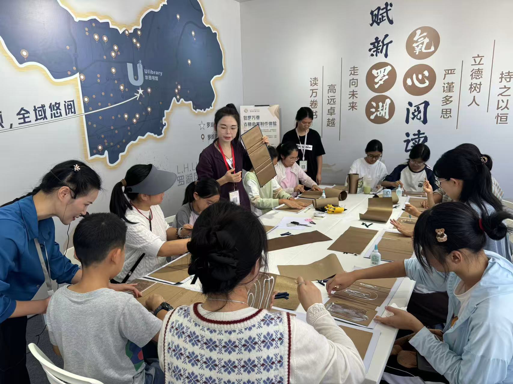 活动以“传统活化”为核心,将抽象文化转化为可操作、可感知的阅读实践,构建起“典籍—技艺—精神”的三层深读体系。在古籍与非遗传承领域,推出“古籍函套制作”“纸浆画创作” 等体验,读者通过裁剪、装订、揉捏等指尖动作,触摸古籍保护的技艺温度,让典籍传承从书本概念变为沉浸式实践;在传统美学传播中,以“非遗簪花”“干花浮游瓶”等手作活动为载体,搭建“传统美学 + 现代创意”的转化桥梁,读者在艺术创作中深化对文化内涵的理解,实现审美素养与文化自信的同步提升。这种以“具象体验解码文化内核”的深读方法,为阅读注入新鲜“氧”分,让中华优秀传统文化在阅读场景中真正“活起来”。