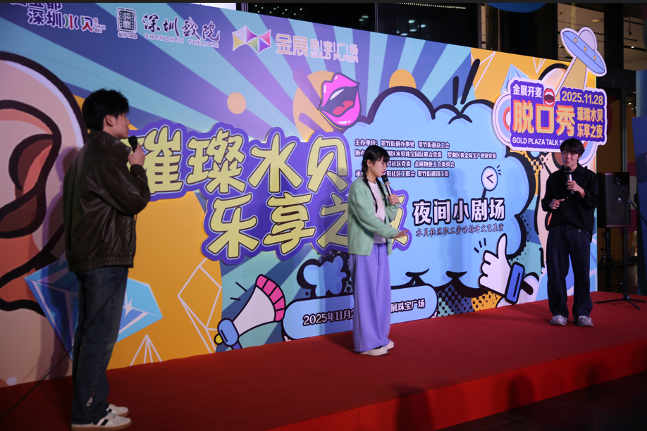 近日,由罗湖区翠竹街道办事处、翠竹街道总工会主办,罗湖区水贝珠宝园区联合党委、罗湖区黄金珠宝产业链党委、水贝社区党委、金展物业工会委员会协办,水贝社区工联会、翠竹街道团委承办的“夜间小剧场”脱口秀专场在金展珠宝广场南广场举行。