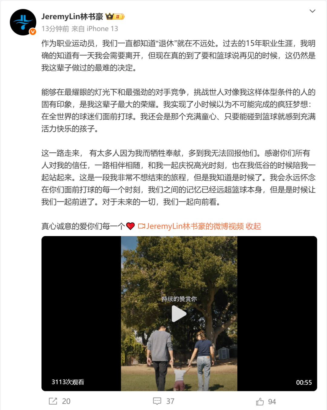 刚过了37岁生日的林书豪,于今早在个人社交平台宣布退役:
