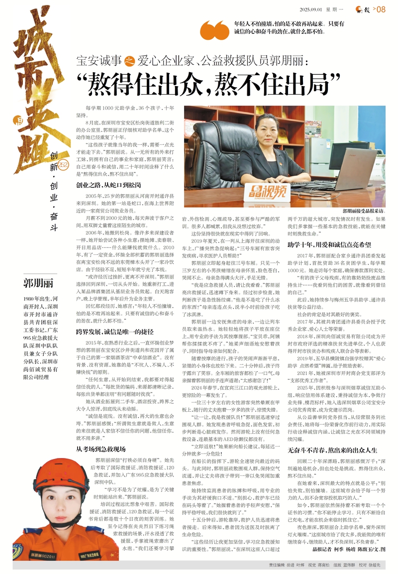 “这些经历让我更加坚信,学习应急救援知识的重要性。”郭朋丽说,“在深圳这座人口超过两千万的超大城市,突发情况时有发生。如果我们多一些能掌握基本的急救技能,就能在关键时刻挽救生命。”