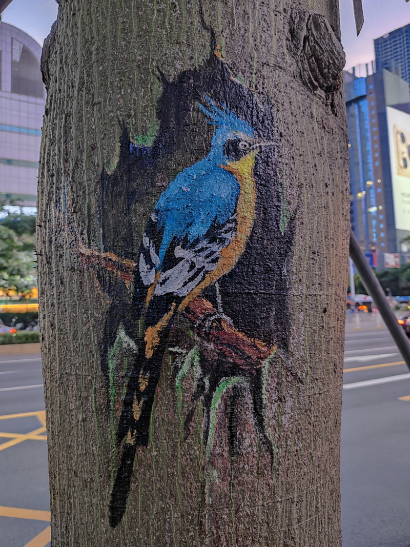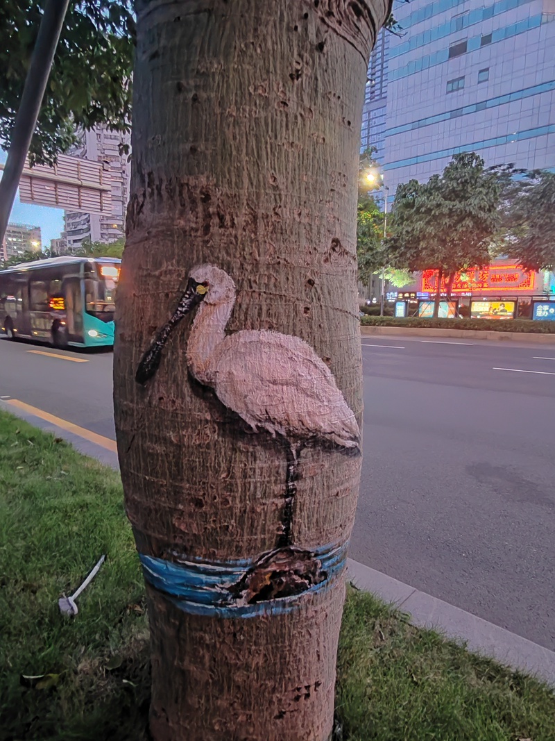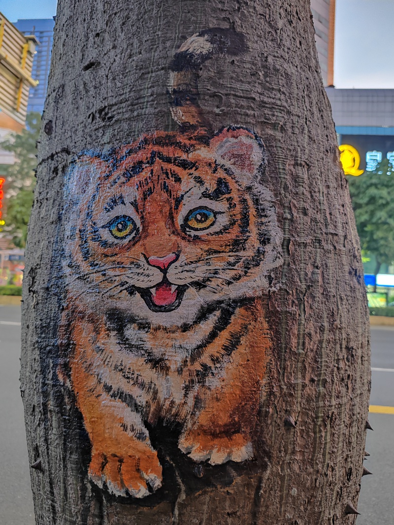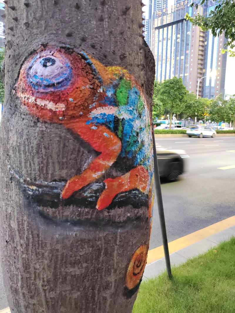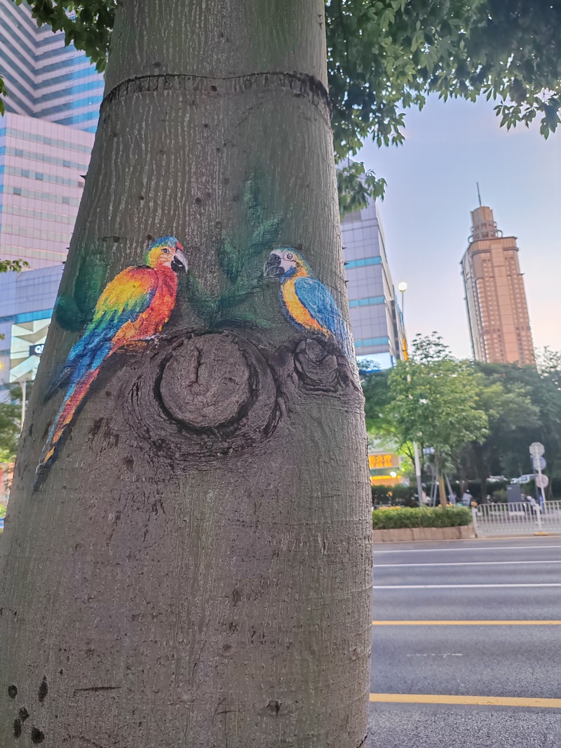 据悉,这是罗湖区城市管理和综合执法局特邀专业画师,在街头开展树画创作,给城市公共空间注入新活力,树画所使用的丙烯颜料不仅无害树木,还能起到一定的遮盖、防护和防虫作用。
