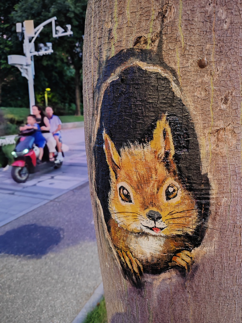 绚丽的鹦鹉、活泼的松鼠、可爱的小浣熊,还有呆萌的变色龙和严肃的黑脸琵鹭……它们从“树画师”营造的黑色树洞里探出头来,在天然的树疤上或趴或站,让车水马龙和高楼林立的城市风景多了一点点自然的雅趣。