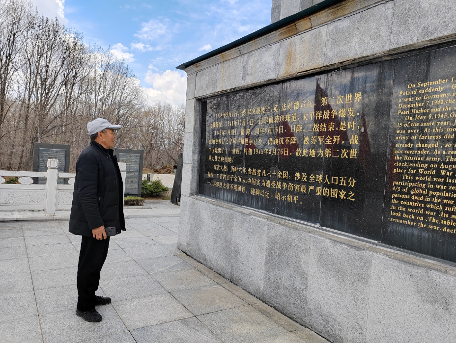 在二战终结地纪念碑广场上,71岁的胡柏老人带着全家人从佳木斯自驾而来。他站在纪念碑前,神情庄重,默默地凝视着碑文,眼中闪烁着泪光。“这是孩子们必须要上的一课。只有亲眼看到这些遗址,才能真正明白今天的和平是多么珍贵。”胡柏老人动情地说。