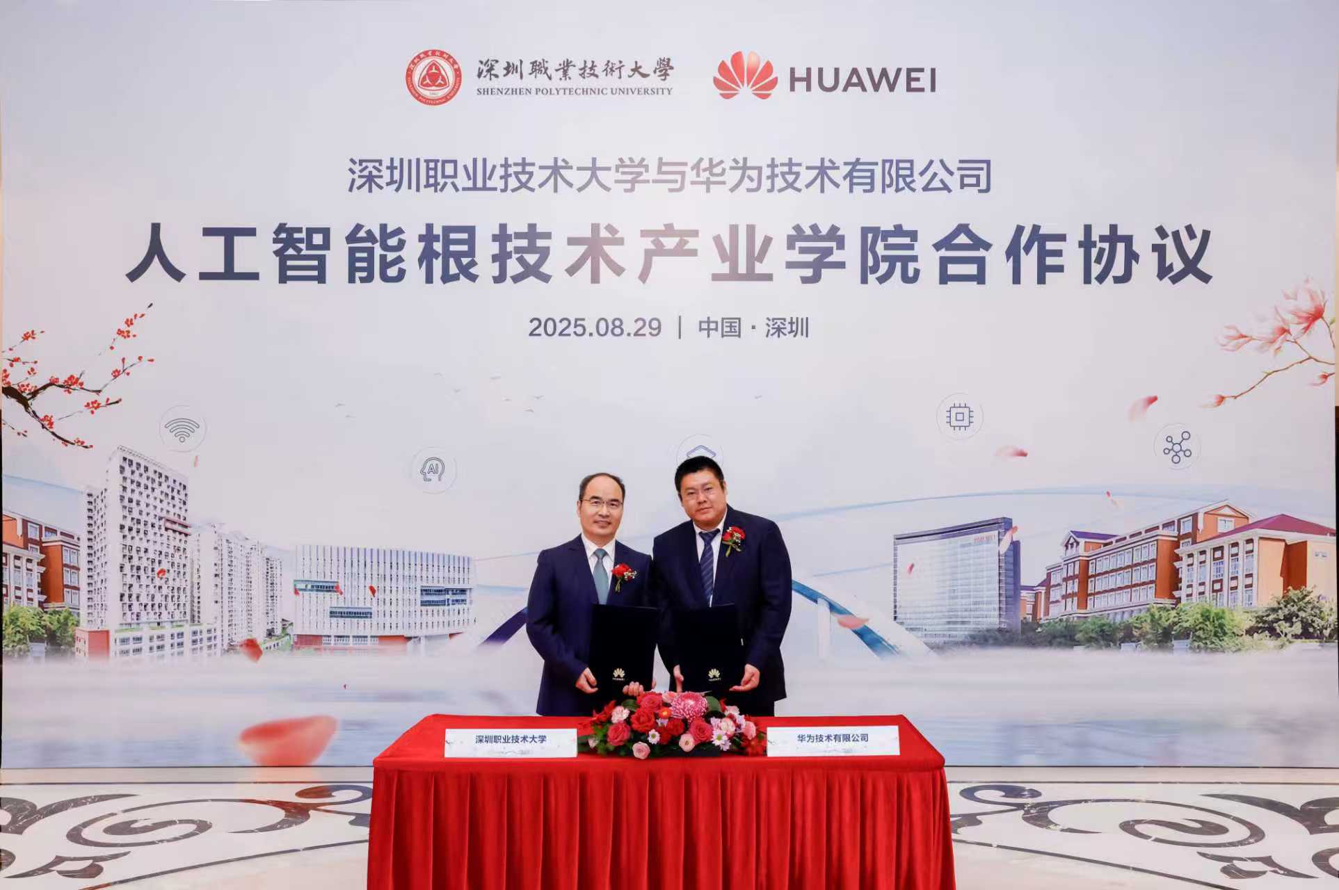 8月29日,深圳职业技术大学(以下简称“深职大”)与华为技术有限公司(以下简称“华为”)签订全面合作协议,深化人工智能人才培养领域合作,共建人工智能根技术产业学院(以下简称“产业学院”)。产业学院将依托华为ICT自主创新技术(根技术),通过构建“体系、载体、社区”三位一体的产教融合新路径,共同制订与持续优化人才培养方案,助力深职大全面推进智算技术深度应用和高水平专业建设。