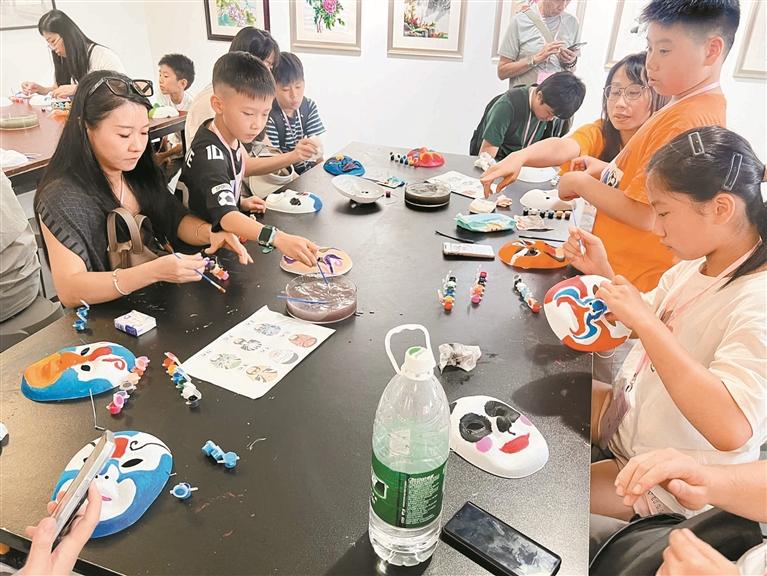 孩子们手持画笔,在空白脸谱上一笔一画勾勒出忠奸善恶的角色特征,感受戏曲文化中的色彩语言与符号象征;大手和小手协作间,一件件素衣通过扎结、浸染,生出蓝白交织、独一无二的花纹;金箔在火焰轻抚下绽放微妙肌理,成为画中的点睛之笔;一柄柄油纸伞在笔下渐次生花,重现江南烟雨中的温婉诗意。